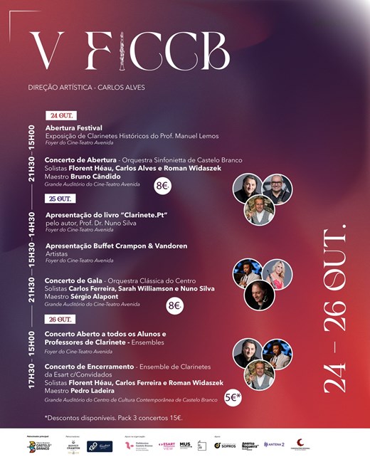 Castelo Branco será novamente o palco onde o clarinete brilha em concertos inesquecíveis, encontros com grandes solistas, apresentações exclusivas e momentos de pura partilha musical.Exposições, masterclasses, grandes entrevistas académicas e apresentações de livros, fabulosos concertos de abertura, gala e um encerramento de tirar o fôlego, tudo reunido num festival que já é referência internacional no mundo do clarinete.
