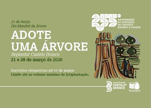 No âmbito do Dia Mundial da Árvore, que se assinala a 21 de março, e integrada nas comemorações do 255º Aniversário da Elevação de Castelo Branco a Cidade, a Câmara Municipal de Castelo Branco promove a Campanha ‘Adote uma Árvore - Replantar Castelo Branco’.A iniciativa surgiu na sequência dos danos provocados pela tempestade Kristin e, após uma primeira fase de recolha de contributos dos munícipes, a Campanha avança agora para a sua componente prática, com o objetivo de unir esforços para tornar o concelho mais verde, resiliente e ambientalmente sustentável.Nesse sentido, o Município convida toda a população a participar ativamente numa ação de (re)plantação de árvores, permitindo que cada participante adote e plante uma árvore, contribuindo diretamente para a recuperação e valorização do património arbóreo do concelho.A iniciativa terá lugar em duas datas e locais distintos:• 21 de março, no Parque Urbano da Cruz do Montalvão• 28 de março, no Parque da Cidade e na Zona de LazerCada participante receberá um Kit de Adoção, composto por:- Uma árvore para plantação local, com aproximadamente 1,5m a 2m- Composto orgânico (valorização de biorresíduos)- Placa de identificação personalizada para colocar junto à árvore- Certificado de Adoção DigitalAs vagas são limitadas e as inscrições são obrigatórias, aceites por ordem de submissão através do formulário online disponível no seguinte endereço: Formulário de Inscrição | "Adote uma Árvore"O prazo para inscrição decorre até ao final do dia 15 de março, ou até esgotar o stock disponível, distribuído da seguinte forma:• 160 árvores para o dia 21 de março• 140 árvores para o dia 28 de março.