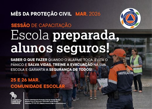 No âmbito das comemorações do Mês da Proteção Civil, o Serviço Municipal de Proteção Civil de Castelo Branco irá dinamizar, nos dias 25 e 26 de março, um conjunto de ações de sensibilização dirigidas à comunidade escolar, subordinadas ao tema “Estar preparado para uma evacuação na escola”.Estas iniciativas serão realizadas em vários estabelecimentos de ensino do concelho e terão como principal objetivo reforçar a preparação e capacitação dos alunos em contexto de emergência.As atividades vão envolver diretamente os Delegados e Subdelegados de Turma, procurando valorizar e consolidar o seu papel nos procedimentos de evacuação, nomeadamente ao nível da organização, comunicação e apoio aos colegas.Esta ação integra a estratégia que a Câmara Municipal de Castelo Branco tem vindo a desenvolver nos últimos anos, com vista ao reforço da segurança em meio escolar e à melhoria da resposta da comunidade educativa perante situações de risco.O calendário das ações é o seguinte:*25 de março - Escola Afonso de Paiva*25 de março - Escola José Sanches (Alcains)*26 de março - Escola João Roiz*26 de março - Escola Amato LusitanoCom esta iniciativa, o Município albicastrense reafirma o seu compromisso com a promoção de uma cultura de segurança e prevenção junto da população escolar, contribuindo para comunidades mais informadas, preparadas e resilientes.