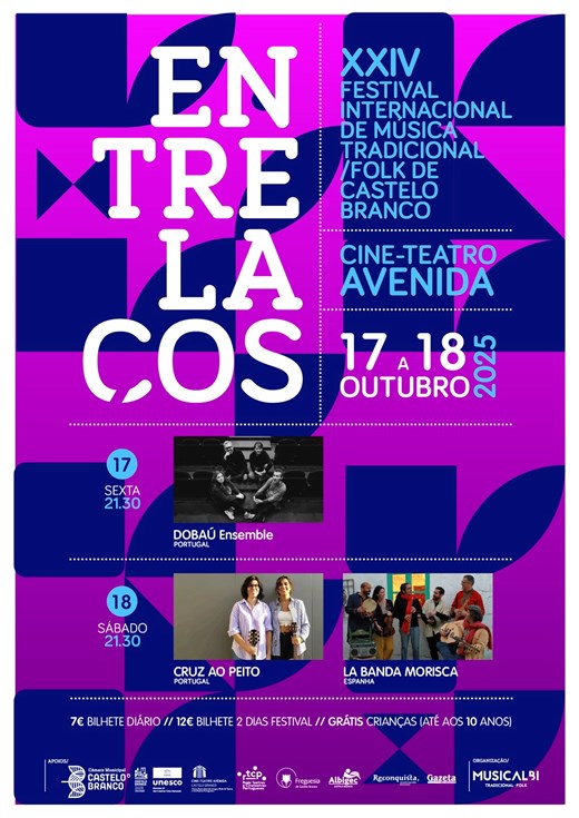 Entrelaços – Festival Internacional de Música Folk Entrelaços – XXIV Festival Internacional de Música Folk de Castelo Branco, com organização do Grupo Musicalbi, decorre nos dias 17 e 18 de outubro, no Cine-Teatro Avenida, em Castelo Branco, e continua o seu caminho, a desbravar o território das chamadas Músicas do Mundo, com uma visão alargada do seu horizonte e sem fechar os olhos a campos musicais alternativos e diversos. Mais do que um festival de Músicas do Mundo ou música de raiz tradicional, o Entrelaços é um festival que procura explorar uma realidade mais complexa e miscigenada, no fim de contas, um espelho do nosso tempo: músicas com fontes muito diversas, marcadas pelos contactos entre artistas de origens geográficas e culturais diferentes, devedoras dos movimentos de ideias e pessoas que definem a contemporaneidade. Dia 17 de Outubro 21h30 (6ª feira) • DOBAÚ Ensemble (Portugal) Dia 18 de Outubro – 21h30 (sábado) • CRUZ AO PEITO (Portugal) • LA BANDA MORISCA (Espanha)