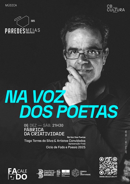 “Na Voz dos Poetas” é um concerto que encerra o ciclo Paredes Meias 2025 - Fado e Poesia, reunindo em palco Tiago Torres da Silva e vários músicos e artistas convidados, para interpretar os novos poemas criados ao longo do ano pelos participantes dos workshops de escrita para fado.Durante quatro fins-de-semana intensivos, Tiago Torres da Silva — um dos mais importantes letristas do fado contemporâneo — orientou a criação de textos originais inspirados na Beira-Baixa e escritos para as melodias tradicionais do fado.Neste encontro especial, essas criações ganham finalmente voz, através de diferentes intérpretes, incluindo um tema original do próprio letrista, escrito para esta celebração.Será um espetáculo único, que celebra a palavra, a música e a identidade cultural da região, revelando novos autores e novas histórias cantadas.Uma oportunidade de ouvir fado com poesia nova, autêntica e profundamente ligada ao território.